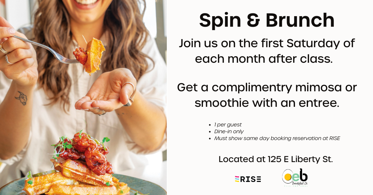 Join us on the 1st Saturday of each month immediately after classes at OEB. Skip the line, and get a free mimosa or smoothie when you dine in!